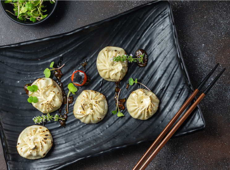 Choose from vegetable, chicken or pork filling. Served with dipping sauce and garnish.